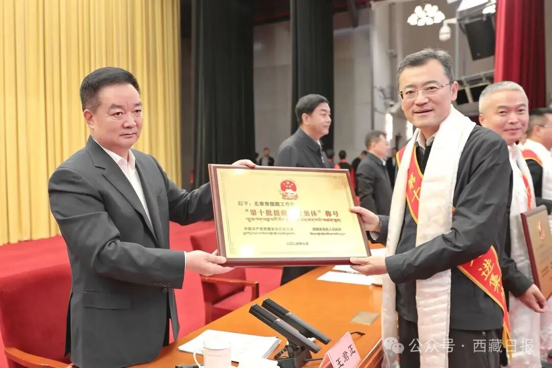 7月28日,全区第十批、第十一批援藏干部人才迎送大会在拉萨召开。自治区党委书记王君正、中组部部务委员兼干部一局局长石军出席并讲话。这是王君正向受表彰先进集体颁奖。记者 白玛泽旺 摄
