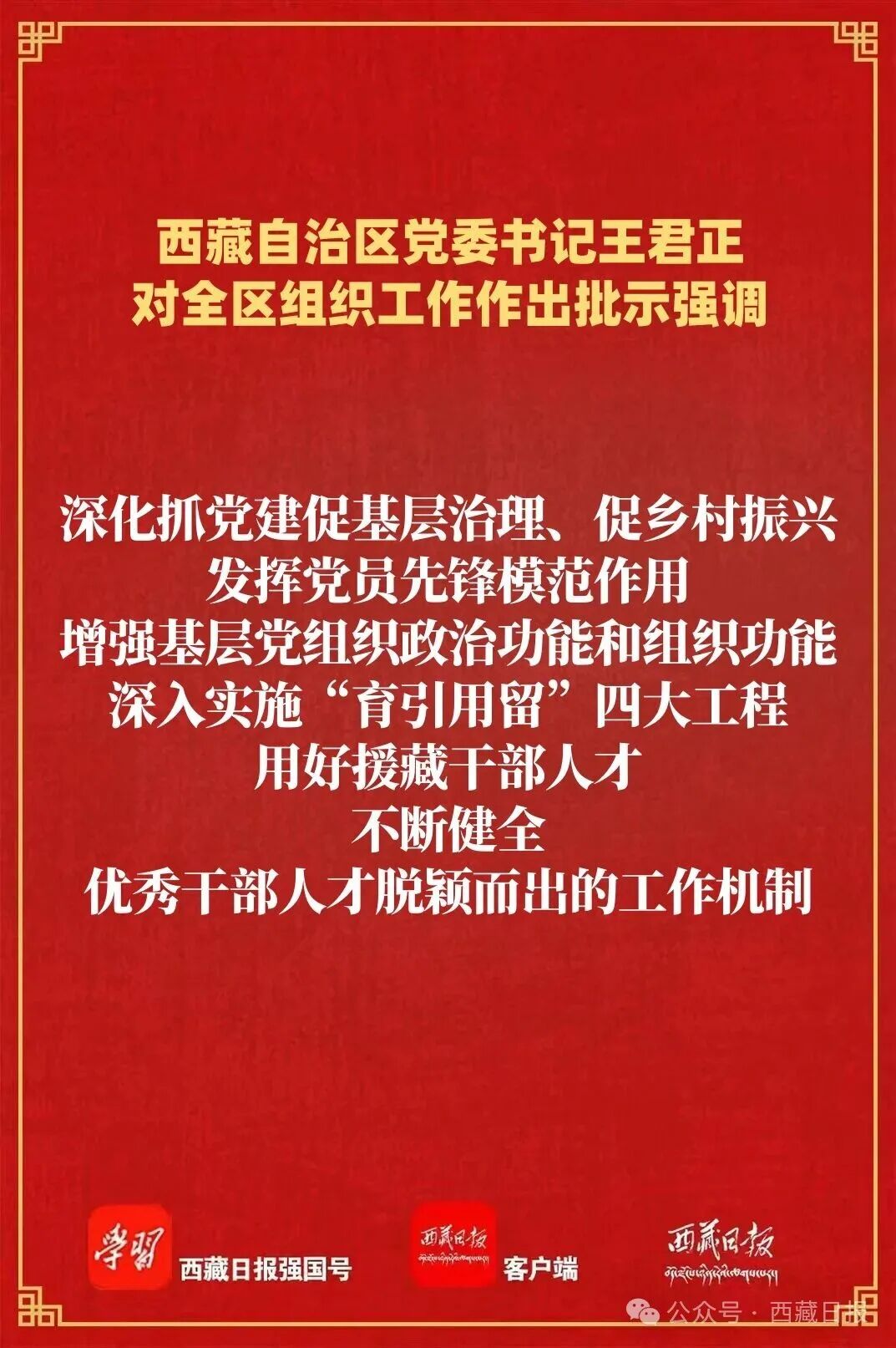 王君正在批示中指出,2025年,全区各级组织部门深入学习贯彻习近平总书记关于党的建设的重要思想、关于党的自我革命的重要思想、关于西藏工作的重要指示和新时代党的治藏方略,坚持组织路线服务政治路线,开展深入贯彻中央八项规定精神学习教育,凭能力用干部、以实绩论英雄,以考促干、以考选人,扎实做好组织系统各项工作,为推动西藏长治久安和高质量发展提供了坚强组织保证。