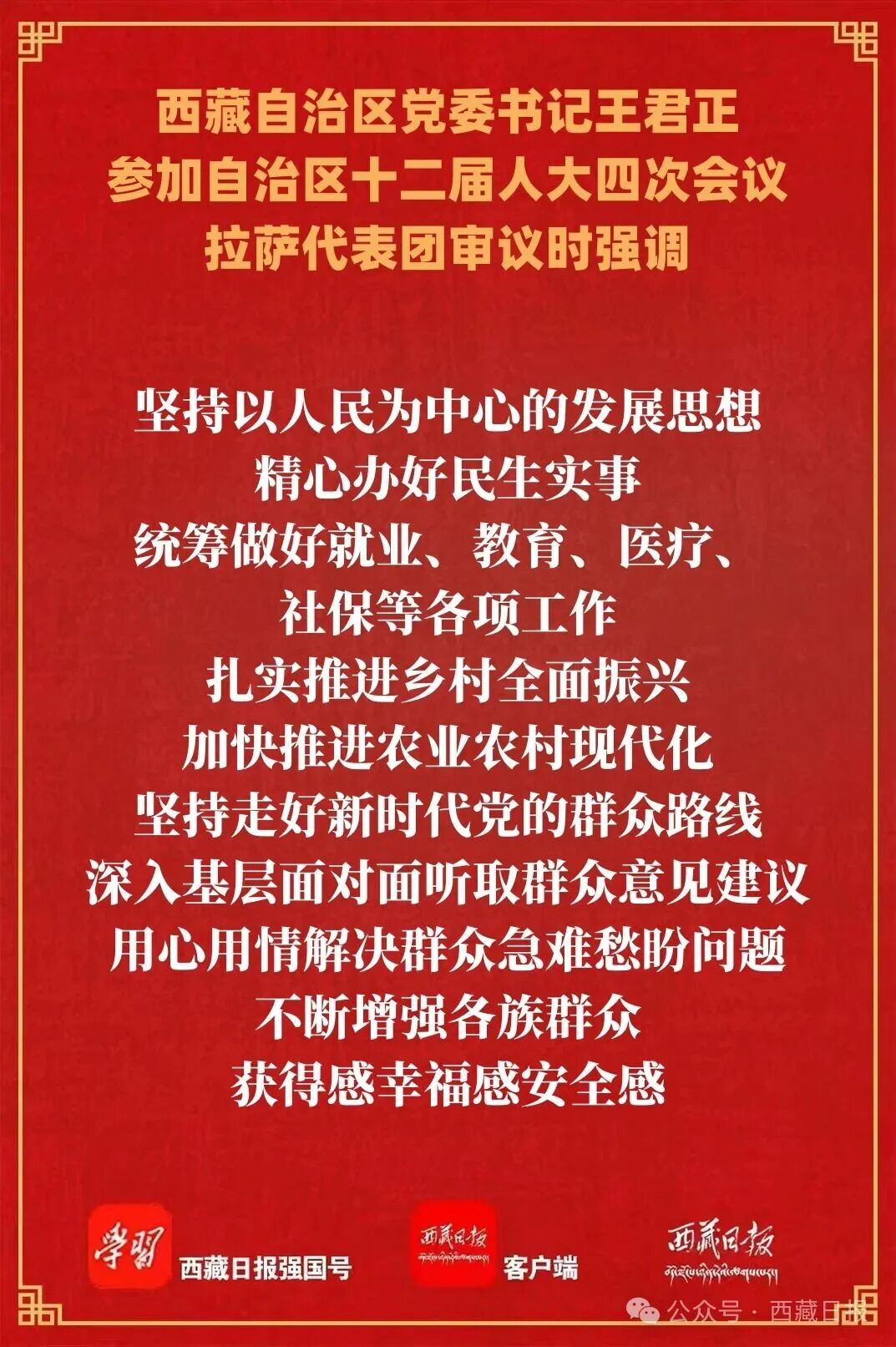 王君正说,嘎玛泽登同志所作的政府工作报告,贯彻党的二十大和二十届历次全会精神,以习近平总书记关于西藏工作的重要指示和新时代党的治藏方略统揽工作全局,总结成绩客观全面,部署工作重点突出,我完全赞成。