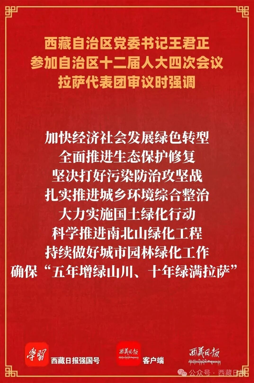 王君正强调,要坚持统筹兼顾,推动“四件大事”落实落地,确保“十五五”开好局起好步。巩固团结稳定的政治和社会局面,贯彻落实习近平法治思想,树牢总体国家安全观,坚持把维护稳定作为第一位的政治任务常抓不懈,警钟长鸣、警惕常在,深入开展反分裂斗争,进一步提升社会治理效能,扎实推进中华民族共同体建设,加强宗教事务治理法治化,深入开展“三个意识”教育,积极引导藏传佛教与社会主义社会相适应,为长治久安打下坚实基础,让拉萨更加和谐稳定。因地制宜推动高质量发展,完整准确全面贯彻新发展理念,积极扩大有效投资,加快重大项目建设,以项目的点带动产业的线、壮大经济的面,大力发展特色优势产业,培育壮大新兴产业,因地制宜发展新质生产力,加快建设现代化产业体系,持续优化营商环境,加大招商引资力度,激发民间投资活力,深挖消费市场潜力,实施提振消费专项行动,着力打造消费新场景,拉动消费新需求,确保经济发展当前有活力、未来有潜力。持续保障和改善民生,坚持以人民为中心的发展思想,精心办好民生实事,统筹做好就业、教育、医疗、社保等各项工作,扎实推进乡村全面振兴,加快推进农业农村现代化,坚持走好新时代党的群众路线,深入基层面对面听取群众意见建议,用心用情解决群众急难愁盼问题,不断增强各族群众获得感幸福感安全感。持续推进现代化人民城市建设,认真践行人民城市理念,把人民放在城市建设的主体地位,更加注重以人为本,转变城市发展理念,推进科学性规划和现代化治理,加强城市建设整体部署和顶层设计,科学布局各类公共文化资源,突出城市特色风貌,彰显历史文化底蕴,高质量推进城市更新,为各族干部群众创造良好生活和工作环境,不断增强主人翁意识,努力把拉萨市建设成创新、宜居、美丽、韧性、文明、智慧的现代化人民城市。着力建设人与自然和谐共生的美丽家园,深入贯彻落实习近平生态文明思想,加快经济社会发展绿色转型,全面推进生态保护修复,坚决打好污染防治攻坚战,扎实推进城乡环境综合整治,大力实施国土绿化行动,科学推进南北山绿化工程,持续做好城市园林绿化工作,确保“五年增绿山川、十年绿满拉萨”。努力建设强边大后方,从政治和全局的高度,深刻把握在强边固防中的职责使命,加强服务保障能力建设,深入开展宣传教育,深化双拥共建,切实筑牢国家安全屏障。