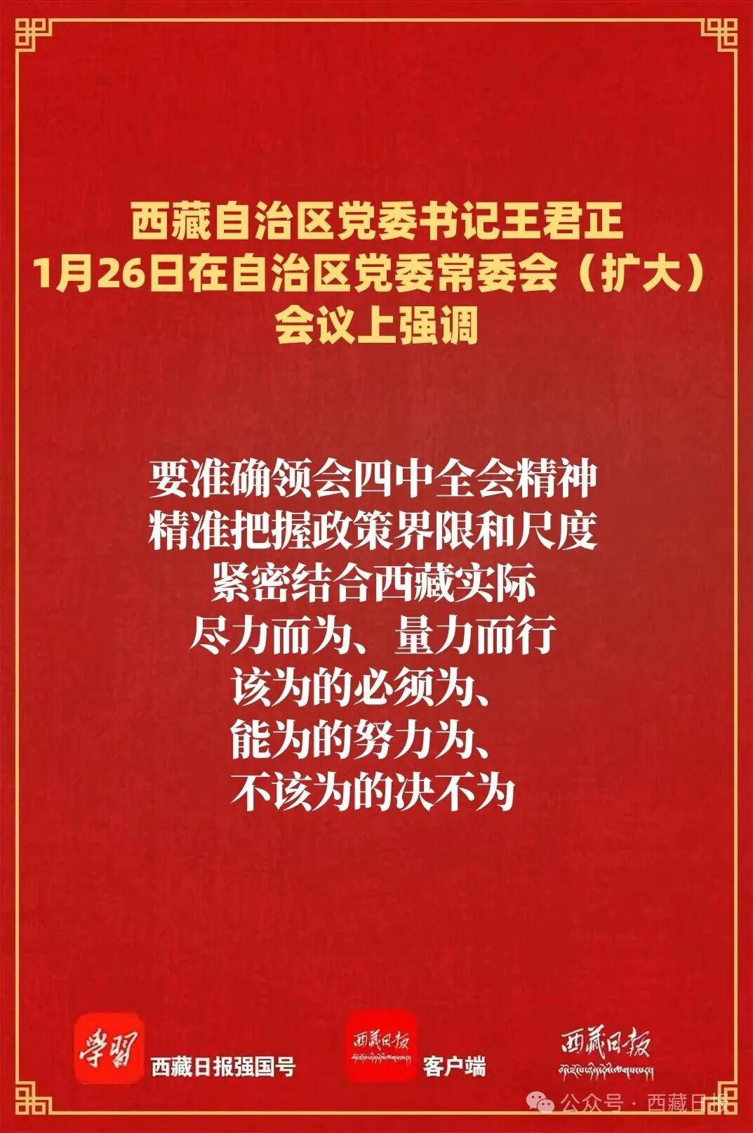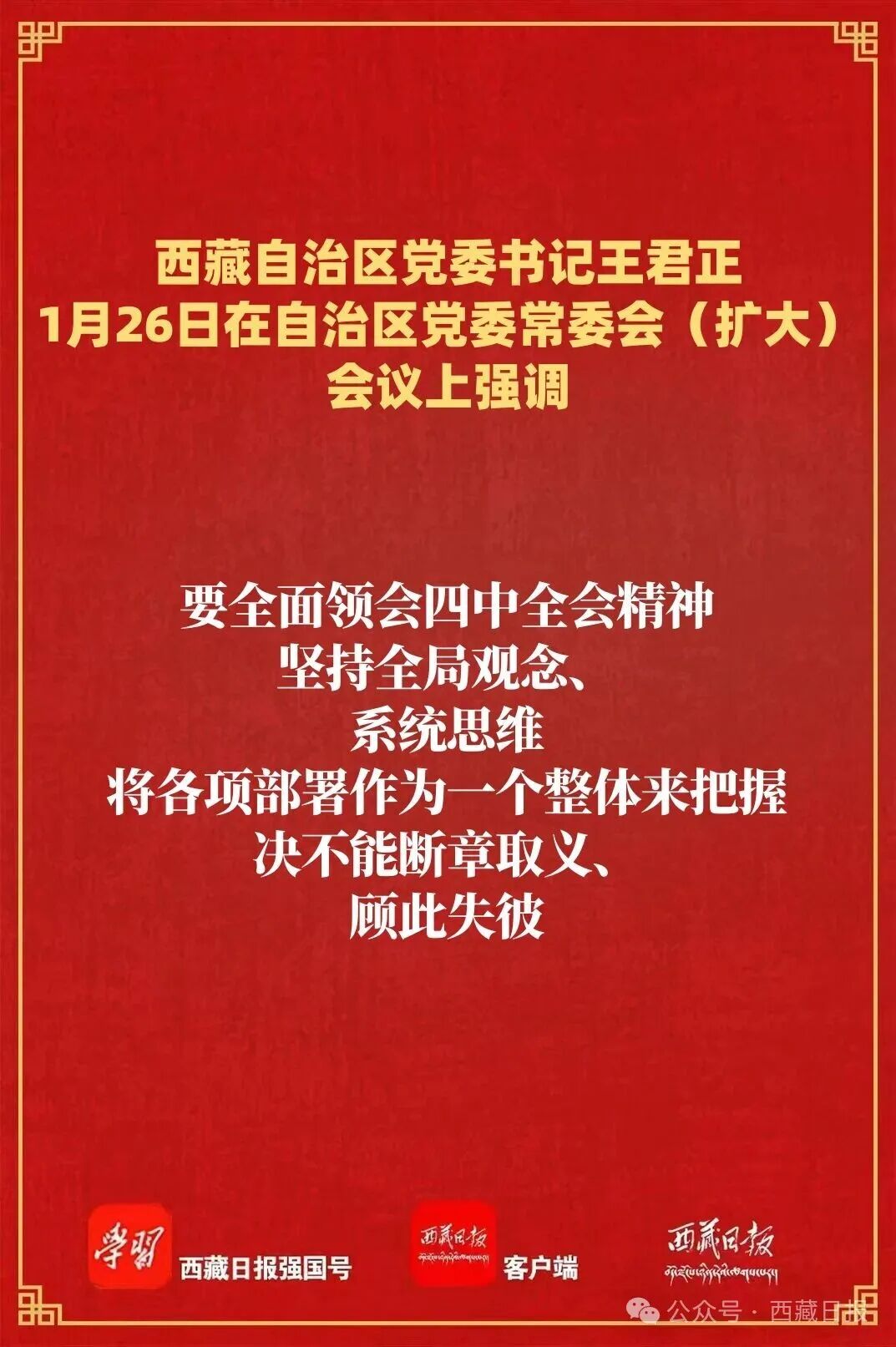 1月26日,自治区党委书记王君正主持召开自治区党委常委会(扩大)会议,认真传达学习习近平总书记在省部级主要领导干部学习贯彻党的二十届四中全会精神专题研讨班开班式上的重要讲话精神。强调,要深入学习习近平总书记重要讲话精神,全面深刻准确领会和把握党的二十届四中全会精神,持之以恒抓好稳定、发展、生态、强边四件大事落实,确保“十五五”开好局、起好步,为社会主义现代化新西藏建设打下坚实基础。