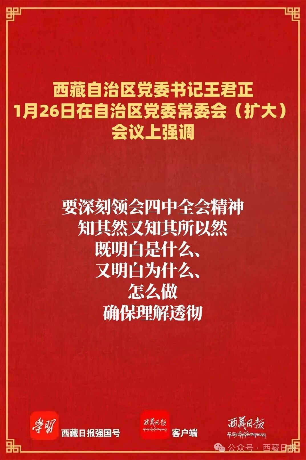 王君正强调,要全面深刻准确领会好、不折不扣贯彻落实好党的二十届四中全会精神,把全区干部群众的思想和行动统一到党中央决策部署上来,确保习近平总书记重要指示精神在雪域高原得到坚决贯彻落实。把学习贯彻习近平总书记重要讲话精神作为当前的一项重要政治任务,要全面领会四中全会精神,坚持全局观念、系统思维,将各项部署作为一个整体来把握,决不能断章取义、顾此失彼;要深刻领会四中全会精神,知其然又知其所以然,既明白是什么、又明白为什么、怎么做,确保理解透彻;要准确领会四中全会精神,精准把握政策界限和尺度,紧密结合西藏实际,尽力而为、量力而行,该为的必须为、能为的努力为、不该为的决不为。深刻理解把握中国特色社会主义制度的政治优势,深刻领悟“两个确立”的决定性意义,增强“四个意识”、坚定“四个自信”、做到“两个维护”,进一步深化党对制定和实施五年规划的规律性认识,进一步认识到习近平总书记为西藏明确的稳定、发展、生态、强边四件大事是一项长期任务和系统工程,需久久为功、锲而不舍,结合实际科学编制西藏“十五五”规划纲要及专项规划,集中精力办好自己的事,切实把习近平总书记擘画的宏伟蓝图变为美好现实。