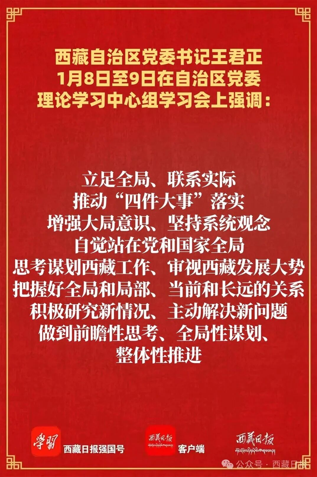 王君正强调,要弘扬理论联系实际的学风,恪尽职守、努力工作,以求真务实的精神推动社会主义现代化新西藏建设。不断提高政治站位,确保党中央政令畅通。坚持“第一议题”抓学习、“第一遵循”抓贯彻、“第一政治要件”抓落实,严明政治纪律和政治规矩,做到党中央提倡的坚决响应、党中央决定的坚决执行、党中央禁止的坚决不做,扎实抓好中央巡视反馈意见整改,及时组织“回头看”,确保西藏各项工作始终沿着习近平总书记指引的方向前进。坚持人民至上,夯实党的执政根基。坚持以人民为中心的发展思想,加强对各项惠民富民政策措施落实情况的监督检查,深化群众身边不正之风和腐败问题整治,带着感情帮助群众解决问题,密切党同人民群众的血肉联系。立足全局、联系实际,推动“四件大事”落实。增强大局意识、坚持系统观念,自觉站在党和国家全局思考谋划西藏工作、审视西藏发展大势,把握好全局和局部、当前和长远的关系,积极研究新情况、主动解决新问题,做到前瞻性思考、全局性谋划、整体性推进。坚持标本兼治,完善工作体制机制。建立健全基层权责清单,持续整治形式主义为基层减负,把中央要求、群众期盼、实际需要、实践经验结合起来,以刚性制度规定和严格制度执行,确保作风建设常态化长效化。