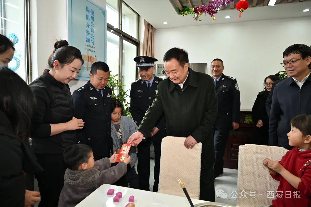 春节、藏历新年期间,2月18日,自治区党委书记王君正深入米林市重大项目建设现场、党群服务驿站、边境派出所,看望慰问坚守一线的基层干部和一线职工,向节日期间坚守岗位的各条战线的广大干部职工致以新年祝福。这是王君正在南伊边境派出所给民警孩子发放红包。记者 旦增西旦 摄