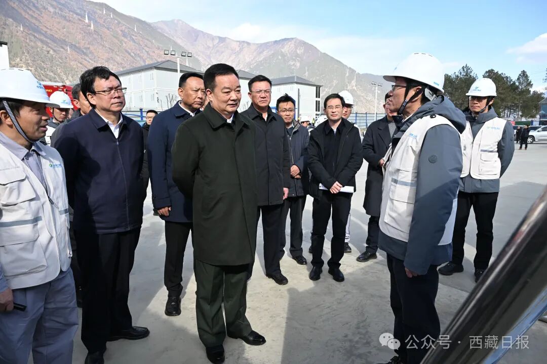 春节、藏历新年期间,2月18日,自治区党委书记王君正深入米林市重大项目建设现场、党群服务驿站、边境派出所,看望慰问坚守一线的基层干部和一线职工,向节日期间坚守岗位的各条战线的广大干部职工致以新年祝福。这是王君正实地察看重大项目建设进展情况,亲切看望慰问一线建设者。记者 旦增西旦 摄