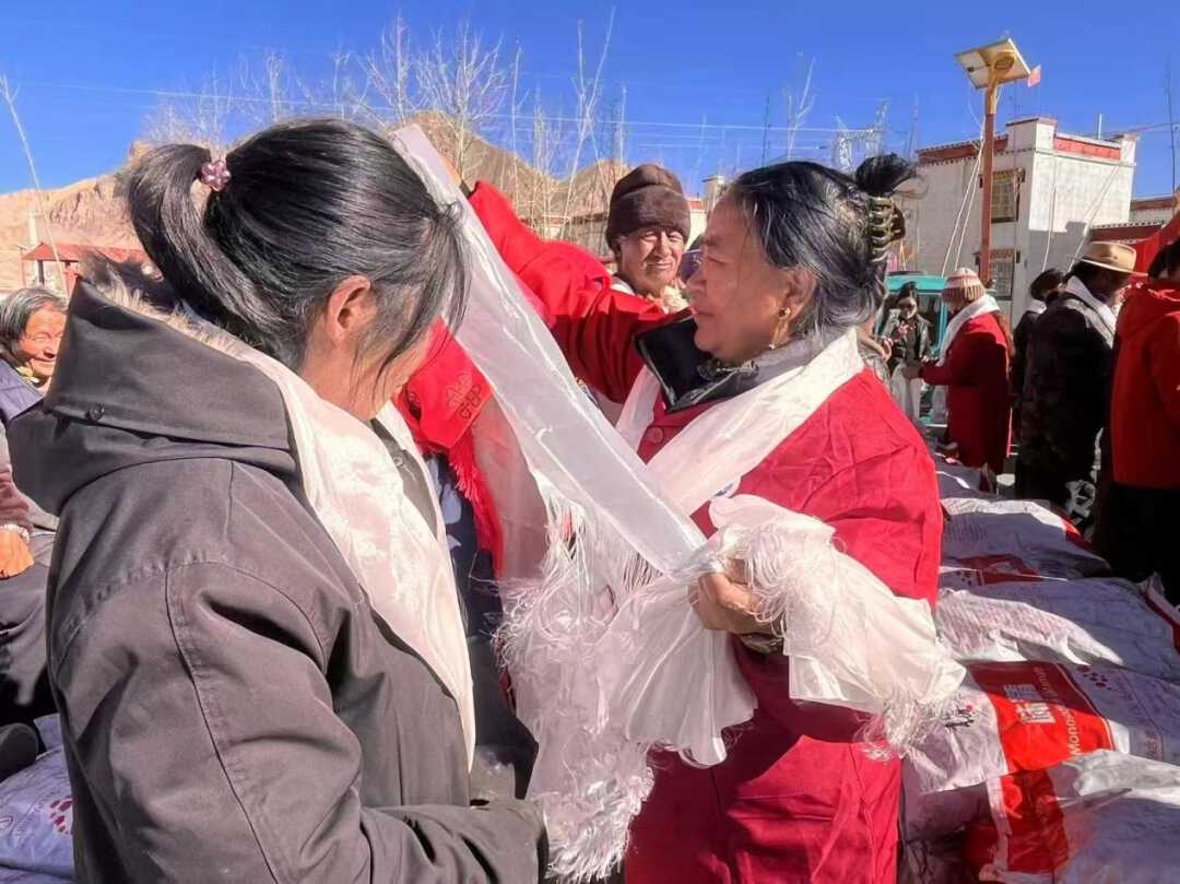 格桑卓玛与合伙人携手创办企业,出资5520元,为48户社区居民送上5袋取暖焦炭。一车车焦炭满载温情抵达社区,一袋袋取暖物资被逐一送到居民家中。居民们为格桑卓玛献上象征圣洁与敬意的哈达。